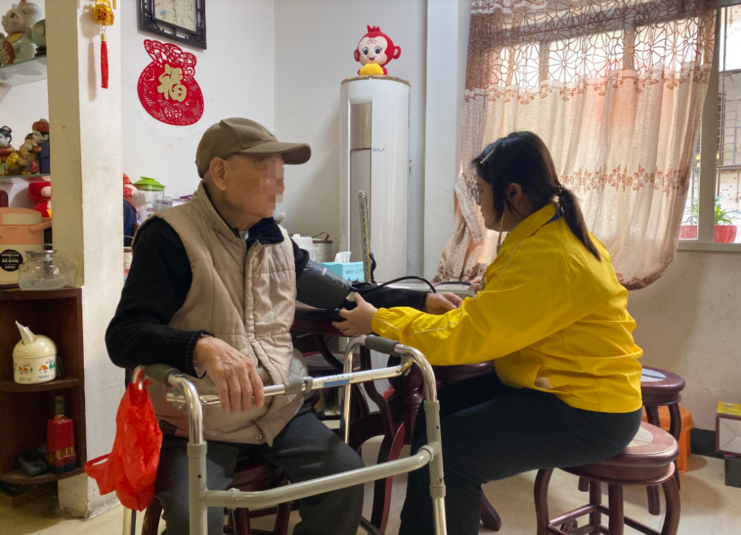 谢世豪是广宁县江屯中心卫生院公共卫生科主任。“江屯中心卫生院服务的65岁及以上失能老人有107人,分布在9个行政村和1个社区。”他介绍,针对中轻度失能老年人,医院每季度分派任务名单,由乡村医生定期联系所管理的失能老年人或其监护人,了解健康状况及服务需求,上门提供咨询服务和健康指导,通知老人到指定地点进行免费健康体检。针对重度及极重度失能老年人,卫生院家庭医生和公共卫生人员定期上门为失能老年人提供血压测量、血糖检测、康复指导、护理技能指导、营养改善指导、心理支持及健康体检等健康服务。